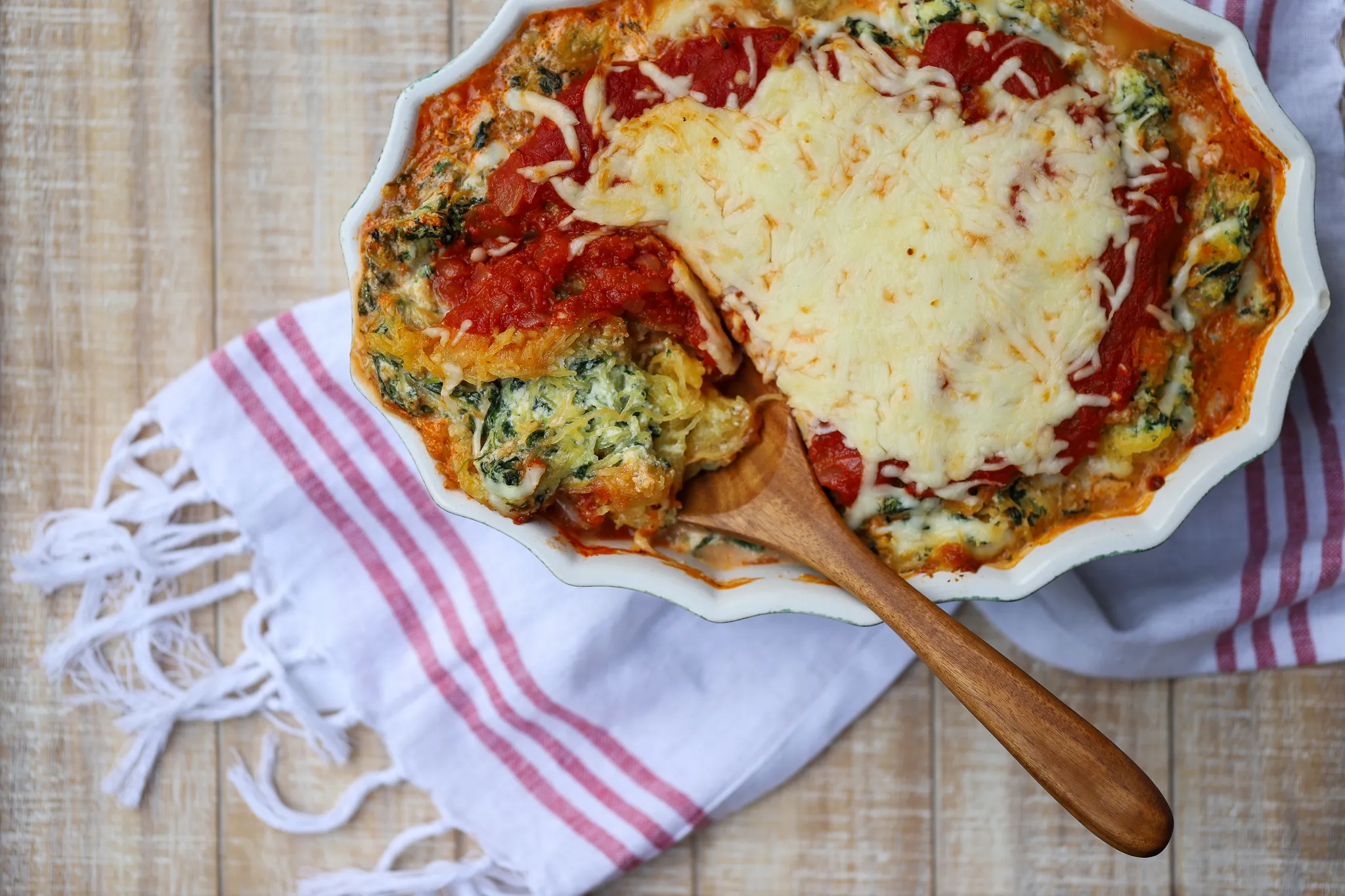 Craving comfort food, but looking for a healthy dish? This recipe uses spaghetti squash instead of lasagna noodles–and is so delicious, you really won’t miss the pasta… and you definitely will not have that post-pasta bloating! (“Ew, David!” anyone else grossed out by the word “bloating?!”). Okay, back to spaghetti squash.